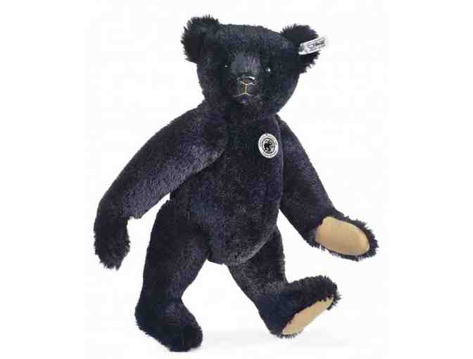This bear is one of only 3,000 made, part of an exclusive 2008 Club Edition inspired by the 1907 black "5228" Teddy bear. This fine replica mirrors the original bear in every detail, including his striking sealing-wax nose. He is crafted from the highest-quality mohair plush with a deep black gloss. His paws are made of woolen felt and his mouth and claws are hand-stitched. He is stuffed by hand with fine wood shavings. His pendant depicts the 2008 Club logo. As a true replica he has, of course, the underscored button in his left ear in the exclusive steel design, making him a very special member of his species. Certificate from Steiff included.