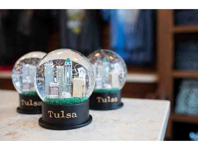Featured buildings in this Tulsa-themed snow globe include Center of the Universe Statue, BOK Tower, Blue Dome, Boston Avenue Church, University Tower, Chase Tower, MidContinent, Atlas, Philtower, Philcade, Mayo Hotel, and BOK Center.