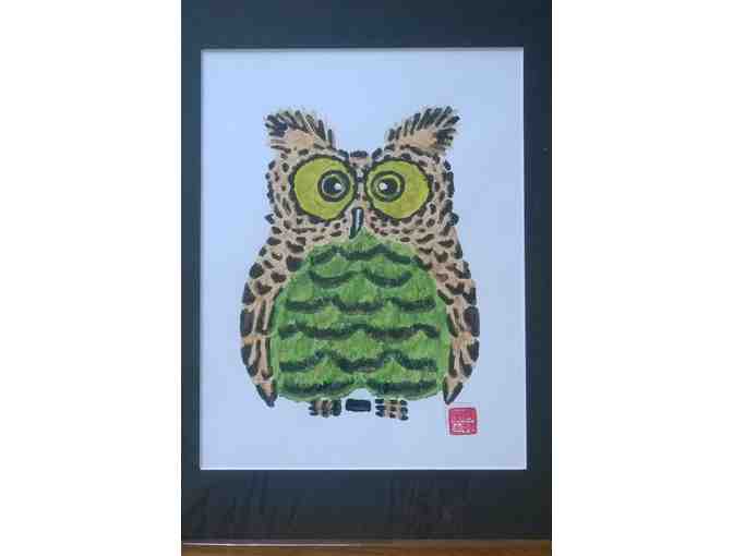 The art of "Gyotaku" and "Tensha-Ho" = putting ink/paint on real, plastic or metal fish or other object and rubbing it onto the paper inspired the artist to use household items as objects for the prints. "I found a cast iron owl and cat trinket to makemy prints and then I added my own artistic ideas and acrylic paint to finiahs the project." Every piece is an original, the red Chinese chop in the right corner reads: Ulla Ringle.