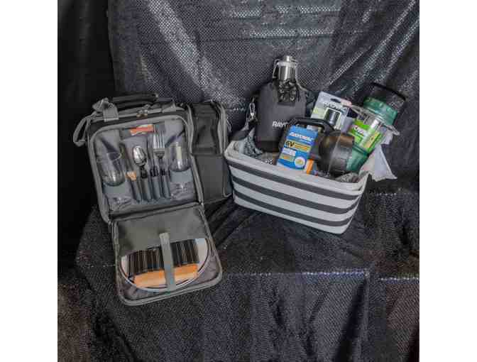 This fun camping basket (included) contains a picnic cooler tote, stainless steel growler, Rayovac lantern and flashlight plus batteries too!