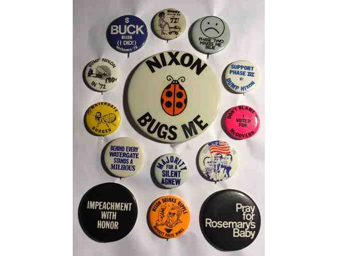 Some of these 14 items were produced by the George McGovern campaign who ran unsuccessfully against Richard Nixon in 1968 when Nixon was elected President and became the 37th President of the United States. Nixon also won the 1972 General Election but was disgraced by the Watergate scandal and resigned in 1974.