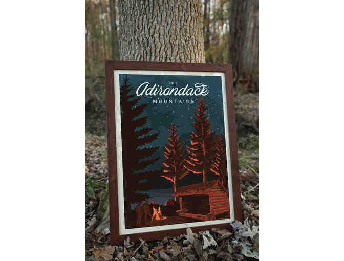 This poster illustration depicts a camping scene in the Adirondacks. With lean-tos scattered throughout the park, they provide a good place for shelter and to setup camp for the night for those backpacking or paddling around the region.
