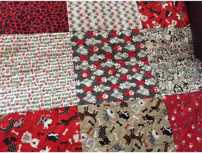 The quilt pattern is a paw print. It comes in an “Eat, Play, Bark” container with 2 Kong balls and some treats.