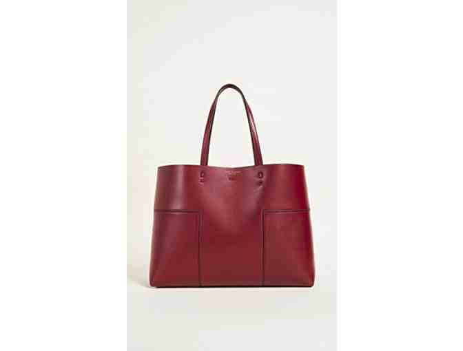 Tonal side panels lend subtle detail to the boxy, smooth-leather, garnet tote. It also features a laser-cut top line, leather-lined interior with optional zip pouch, and slim handles.