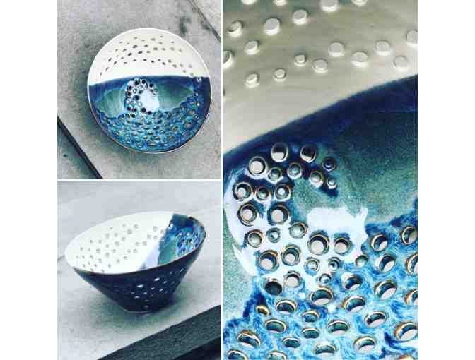 One hand-thrown medium sized (7.5 inch) ceramic fruit bowl/colander in white and pale iridescent blue handmade by Megan Douglas at mpdpottery, Mudstone Studios located at 30 Cutler Street #129 in Warren, RI.