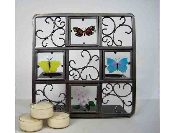 Butterfly Tealight Easel #P7729 made by PartyLite. Heavy metal frame with open windows that have decorative swirls or glass with butterflies and flowers. Back hold 3 tealights. Approx Height 7-1/2", Length 7-3/8"