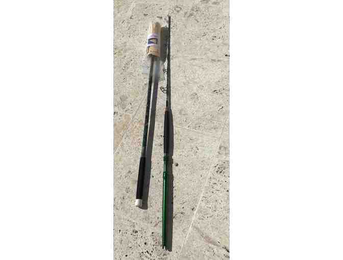 Rod - 30-50 lb trolling rod with a custom green anodized butt, fuji guides and custom out ripped green camo paint.