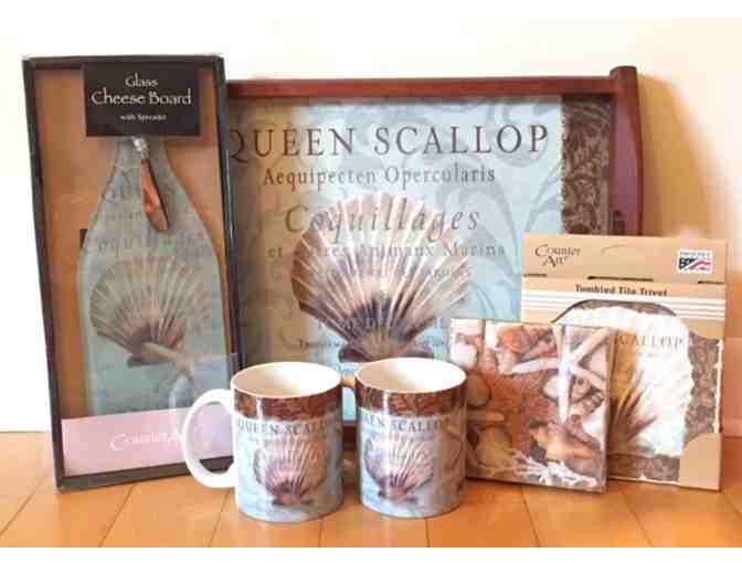 You are bidding on a gift box from Davidson's Drugs. Includes Scallop design Trivet, Cheese Board, Two Mugs, Tray and packet of Napkins.