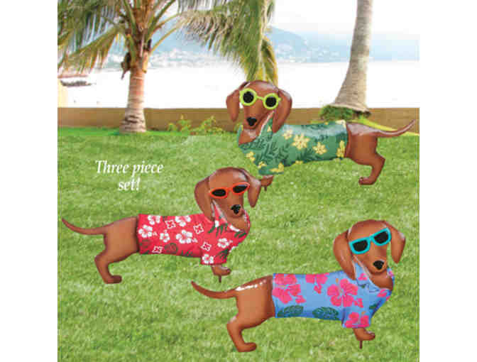 Ready to start the party, these dapper dachshunds are dressed in colorful Hawaiian shirts and sunglasses. The set of 3 doxie stakes easily into the ground anywhere in your yard or garden for a festive display. Hand-painted. Iron. Each is approx. 14 1/4"L x 13 3/4"H.