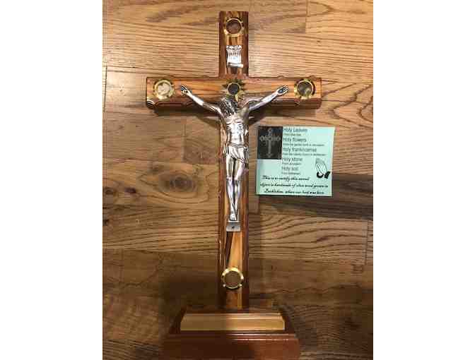 Hand-carved crucifix made in Bethlehem from olive wood, grown in Bethlehem. Height 15" includin stand. Width 8", depth 3".