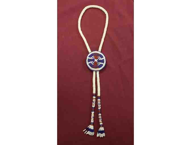 A beautiful basket design bolo tie for men with a beaded fringe accent. Red, royal blue, and white beads adorn this bolo tie that will surely be an eye catcher.