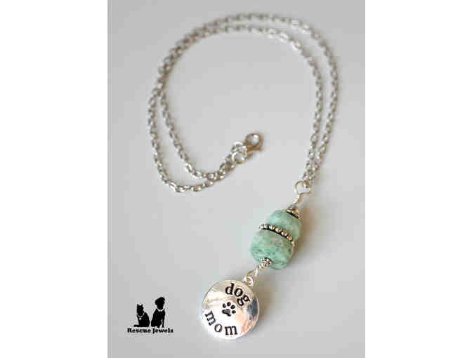 Handmade Dog Mom necklace features a beautiful stone called Chrysocolla and has an 18" chain.