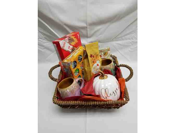 Coffee is the perfect drink for fall! Curl up on the couch with this basket, which contains coffee, ceramic mugs, and fall decor.