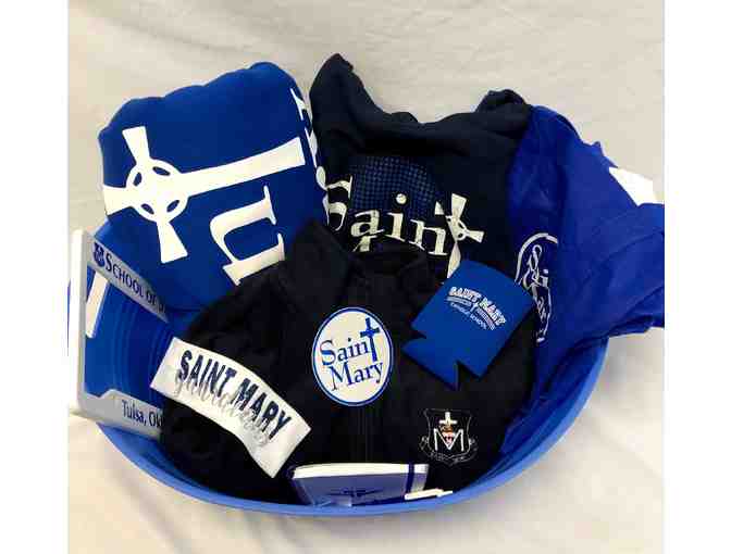 St. Mary blanket, sticker, license plate cover, notebook, pen, youth Large spirit sweatshirt, bag, Koozie, adult large fleece jacket (Crestwear), and headband.