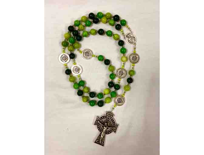 Beautiful hand-made rosary features jade green beads and silver accents. Blessed by Fr. Jack Gleason.