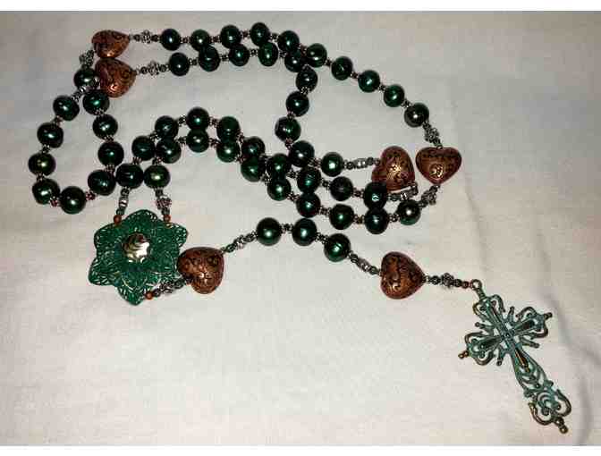 Emerald green dyed freshwater pearl ave beads witih silver and bronze separators. Beautiful designs on the copper heart-shaped pater beads, mother-of-pearl center and patined bronze tone cross. Handmade in Tulsa.