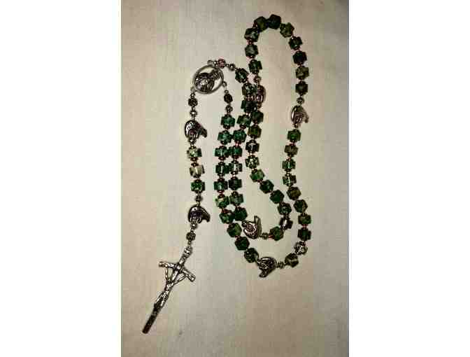 Tree moss agate heishi ave beads with silver and copper separator beads. Silver Native American bears with long life line as pater beads. SHOJ center and papal crucifix. Handmade in Tulsa.