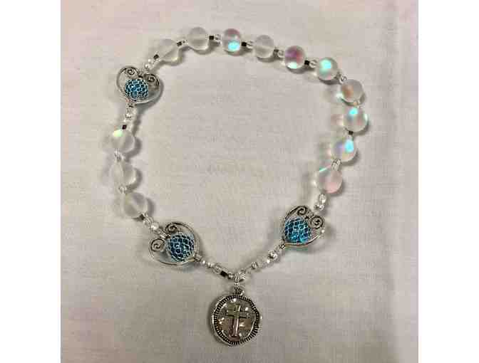 Blue mesh-covered glass beads encased in pretty heart-shaped jackets (pater beads). Luminescent quartz ave beads separated by silver cubes and tiny luminescent beads. Silver disc cross. Blessed by Msgr. Dorney and handmade in Tulsa.