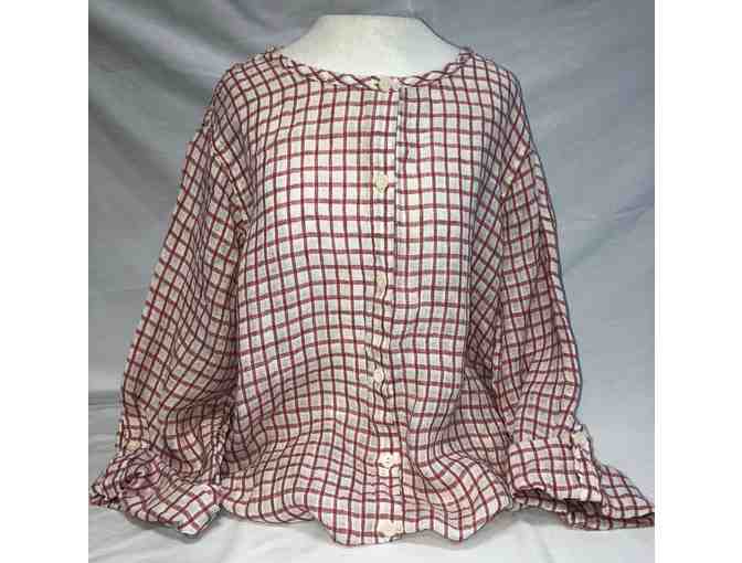 FLAX brand 100% linen look oversized shirt cover. Button tabs to roll sleeves. Cute open or closed. Rose tattersall weave. Ladies' size Small.