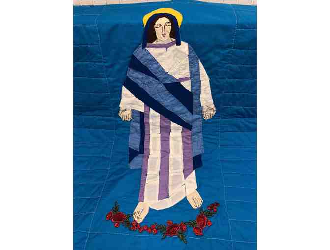 Hand-quilted throw is an interpretation of the Marian Window in the Church of Saint Mary. Made of beautiful blues and purples--all hand sewn--and blessed by Fr. Jack Gleason.