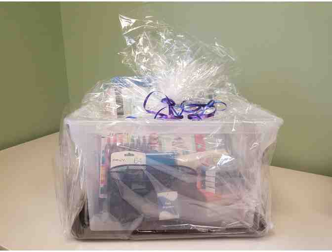 File box filled with fun and fashionable office supplies to help your organze at work or home! Includes clipboard, file folders, Post-it notes, pens, scissors, binderclips, and a desk organizer.