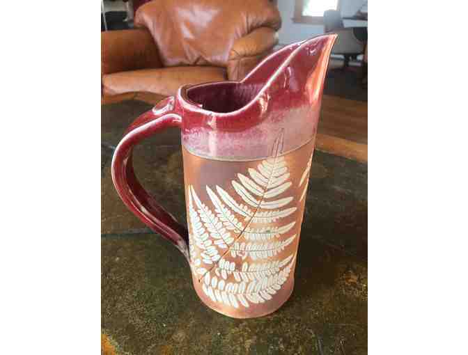 Gorgeous high fired stoneware pitcher with stunning fern impression. Hand crafted by The Good Earth Pottery in Kennebunkport. Owners Dave and Diane Jenkins personally create each piece of pottery.