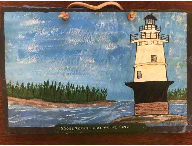 Hand painted slate featuring Goose Rocks Light. Created by G. Warren.
