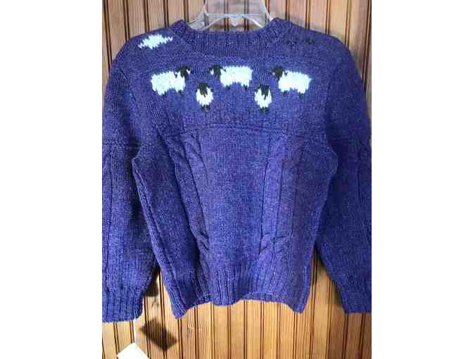 Winter is coming and you will be cozy in this handmaine sweater from the talented Shirley Bradbury. "Sheep In the Meadow" is 100% wool. Women's size medium; chest measures 38.5", sleeves are 16" at the inseam. Care: Handwash in woolite. Air dry.