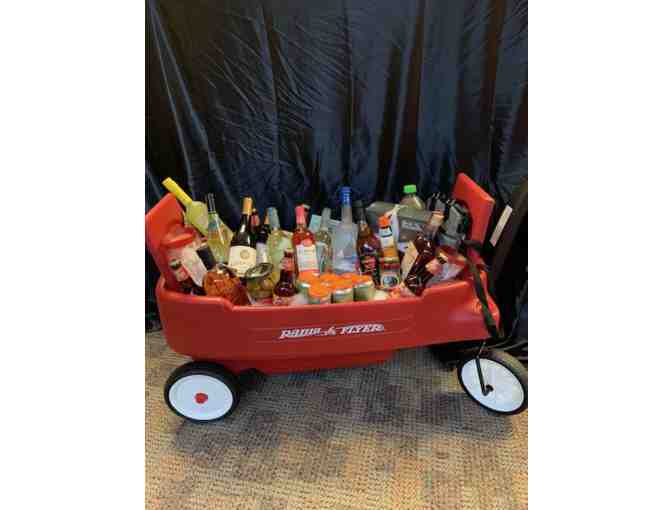 Wagon Filled with a huge assortment of beer, wine and alcohol plus some snacks mixers and an insulated bag.