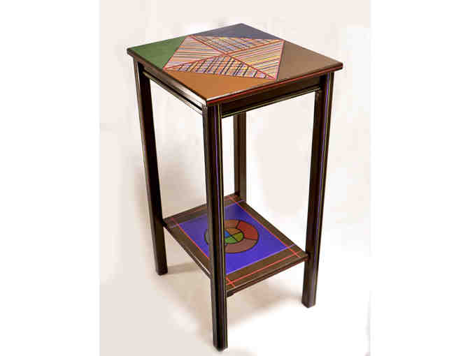 Painted side or display table that stands 28"H with the top that measures 14" X 16" and a lower shelf that measures 10 1/2" X 14". A combination of colorful lines and shapes on a mostly brown background, this table is decorative enough on its own or can hold plants, books, or knick-knacks. Hand-painted by Joel Cohen, the "artist-in-residence" at The Food Market in Hampden and La Food Marketa in The Quarry.