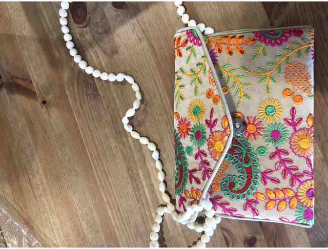 Beige with green, yellow and fuscia floral pattern Indian clutch