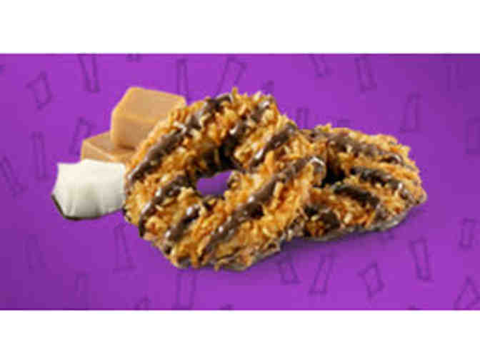Crisp cookies coated in caramel, sprinkled with toasted coconut, and striped with dark chocolate. Not available until February but we have them now!!!