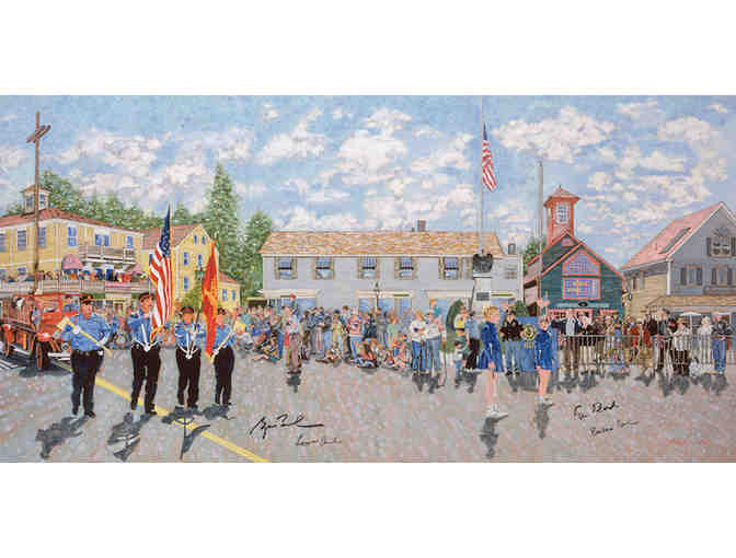 #18 of 1000 printed, artist Will Cunha's 'Memorial Day Parade' is a classic capture of the Memorial Day tribute in Kennebunkport's Dock Square. This version is not signed by George & Barbara Bush.