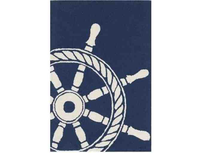 This 20x30 welcome mat features a ships wheel on a navy blue background. Perfect for a home that loves some nautical flair!