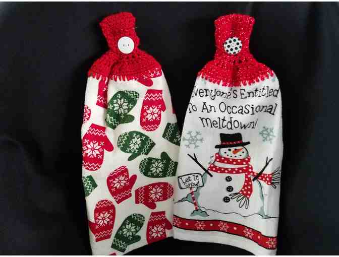 Decorate your oven or cupboard door with these practical and decorative hanging towels. The sentiment on the snowman design reads "Everyone's entitled to an occasional meltdown." Both have hand-crocheted red hangers fastened with a button. Machine washable.