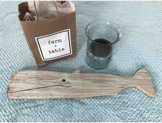 This generous donation is from popular shop, Farm + Table, located in Cape Porpoise. Enjoy this fun wooden whale, perfect for a nautical themed room and a beautiful hurricane lamp that will provide ambiance on warm summer nights or snowy evenings.