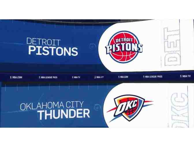 Two game tickets and a parking pass for the Detroit Pistons vs Oklahoma City Thunder at Little Caesars Arena.