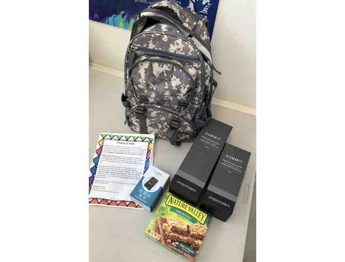 A hiking backpack filled with all the supplies one needs to take a hike with a child. Includes a large and small water bottle that is stainless steel and vacuum insulated keeping things cold or hot for 12 hours, binoculars to discovery the world around, and granola bars to snack on.