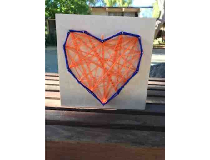 Created and donated by Ellen Thacher Children's Center - a perfect keepsake! Nails on wooden pieces that the children have weaved with yarn to create hearts.