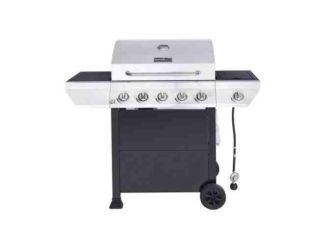 5-Burner Propane Gas Grill in Stainless Steel with Side Burner and Black Cabinet.
