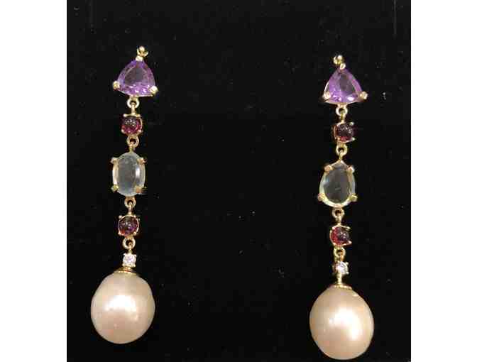 Beautiful Italian designed drop earrings made of sterling silver with 14kt yellow gold overlay with semi precious gemstones with cultured pearl drops.