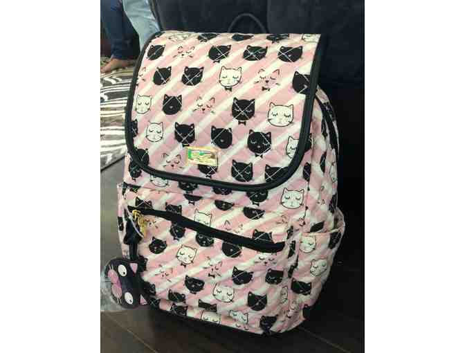 Betsey Johnson Pink Color Quilted Backpack with Cat's Faces Printed all over Cotton/Polyester 2 side pockets, 2 front pockets, 1 plastic pouch for cell phone and one cat's face zipper holder zipper closureInside lined with polyester in pink color, one zipper pocket, 1 cell phone pocket and 3 pen holders Measurements