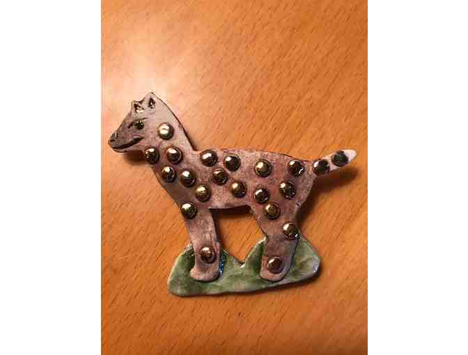 Wolf, the creator of these one-of-a-kind ceramic brooches, is a Renaissance woman whose love and creativity is reflected in all of her work, no matter what the medium. This "Dog Contemplating the World As It Is" pin is porcelain with copper and Mother of Pearl Swarovski crystal and measures 2-1/4". Wolf has been crafting jewelry continuously since 1976 and has made over 80,000 one-of-a-kind pieces!