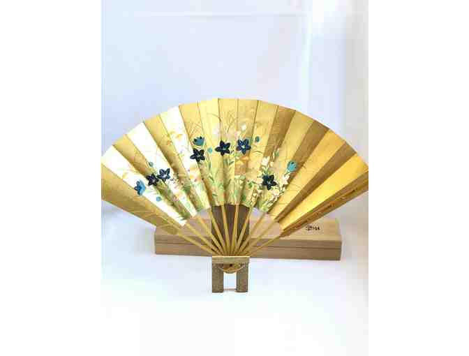 This beautiful gold with blue flowers folding fan could be yours. This decoration could be so beautiful up on your shelf. You don’t want to miss out on this opportunity to have this gorgeous Kazari Oogi (Display Folding Fan).