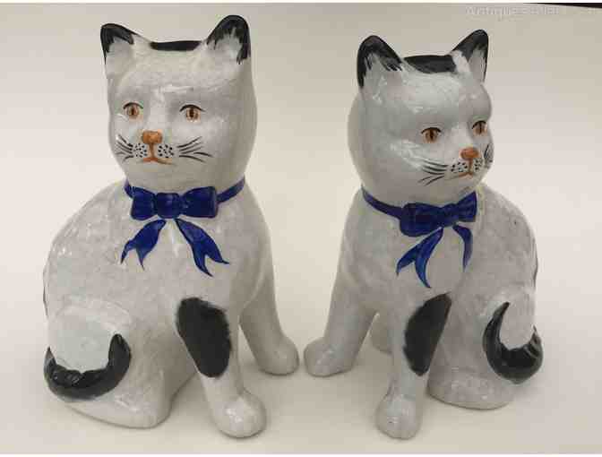 This pair of Staffordshire Early 20th Century Pottery figures of white cats are dressed with a blue bows