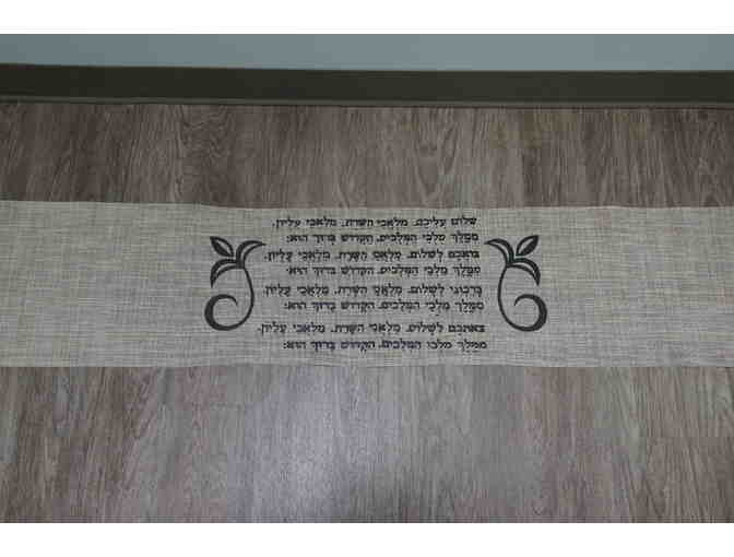 A beautiful Shabbat table runner with the Shalom Aleichem prayer written on it.