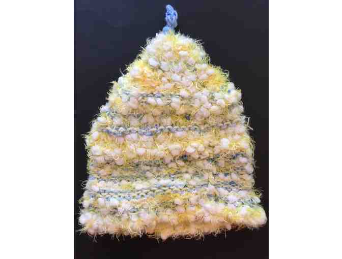 This washable toddler size hat is handknit with fuzzy yellow yarn with blue stripes.