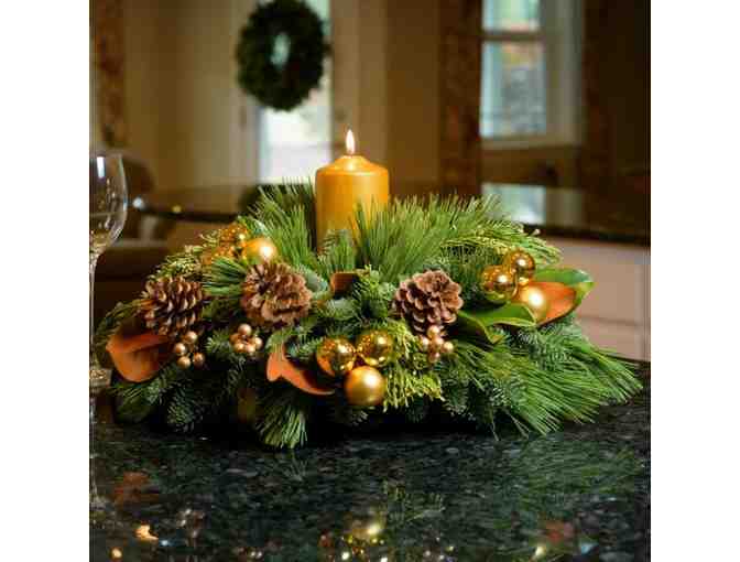 Golden pillar candle lights up the room on this tasteful centerpiece that will carry you from autumn into the holiday season. It will be gorgeous on your holiday table, or as a lovely autumn everyday centerpiece. Magnolia leaves, golden globes, pine cones, fir, and pine create a festive feel.