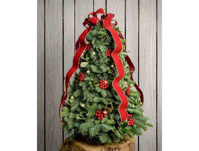 Deck the halls with boughs of fresh noble fir and holly! This tabletop tree will bring joy and holiday cheer to any home. Handmade with noble fir and variegated holly, this classic tree is sprinkled with faux red berry clusters and crowned with a luxurious red velveteen ribbon with gold edging and flowing tails. Includes a pack of white LED Lights - $9.95 Value! This tree measures 18" tall and 14" across. This is not a living tree; it is assembled with sprigs.