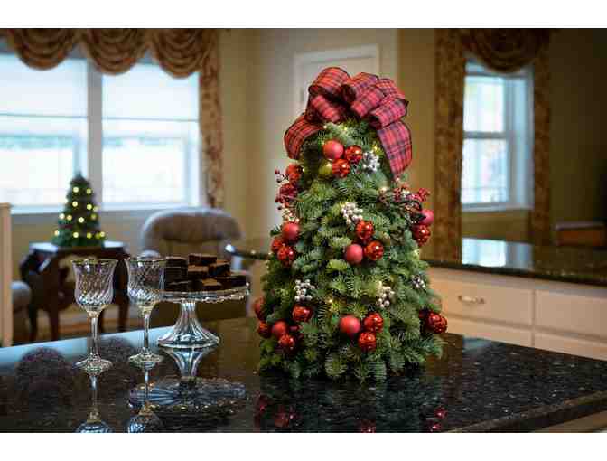 This gorgeous little tree has so much personality and spunk, it is sure to be a crowd pleaser! The contrast of the vibrant evergreens with the shiny red and silver ornaments will bring your seasonal decorating to life. The glorious smell of the fresh evergreens and joyous red and black plaid bow will jazz up your holidays and put you in a festive mood. Includes a pack of white LED Lights - $9.95 Value! This tree measures 18" tall and 14" across. This is not a living tree; it is assembled with sprigs.